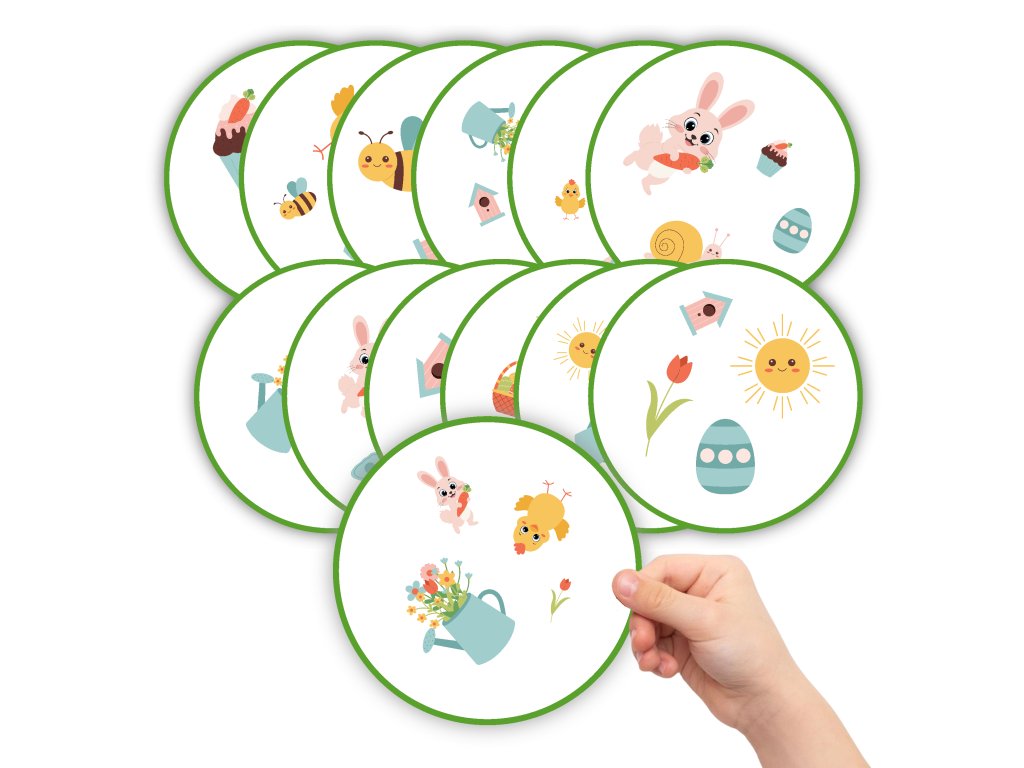 Sada obsahuje 13 kariet s jarnými a veľkonočnými motívmi. Každé dve karty majú práve jeden spoločný obrázok – a úlohou hráčov je nájsť ho čo najrýchlejšie!