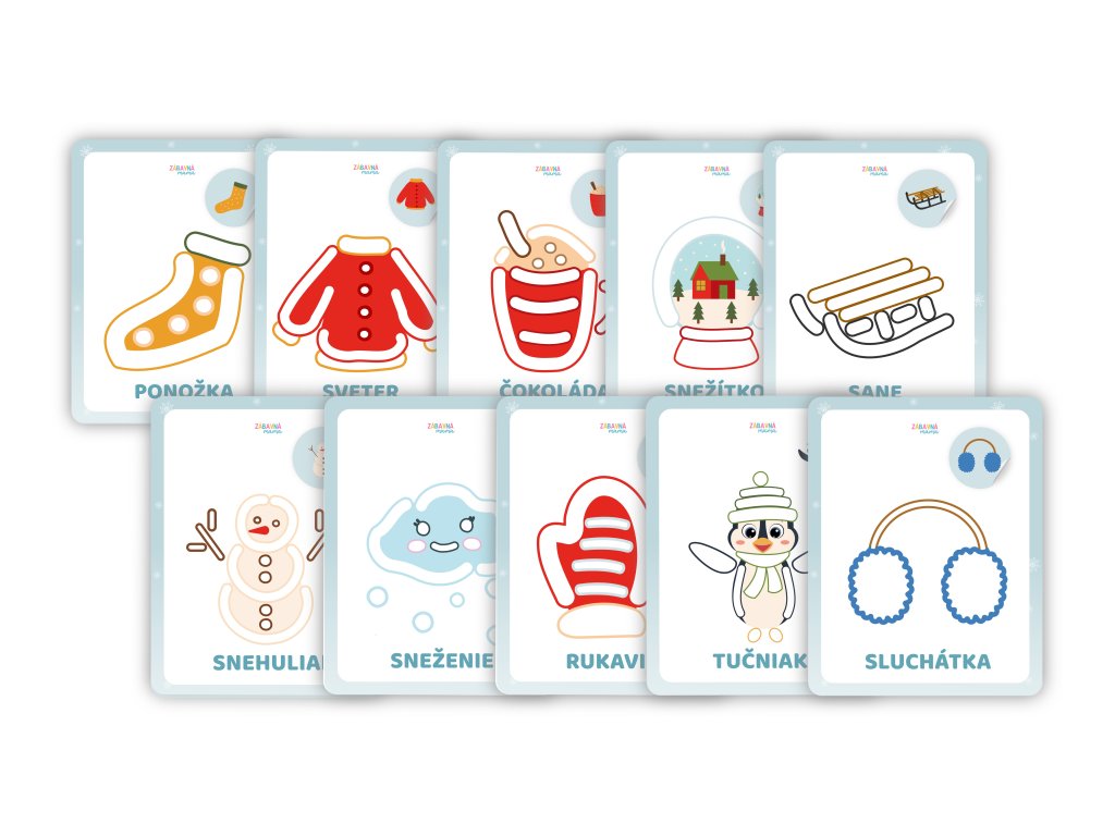 Sada obsahuje 10 tematických kartičiek so zimnými motívmi, ktoré deti dotvárajú pomocou plastelíny alebo modelovacej hmoty. Ilustrácie sú navrhnuté tak, aby deti motivovali k tvoreniu, modelovaniu a skúšaniu vlastných nápadov.